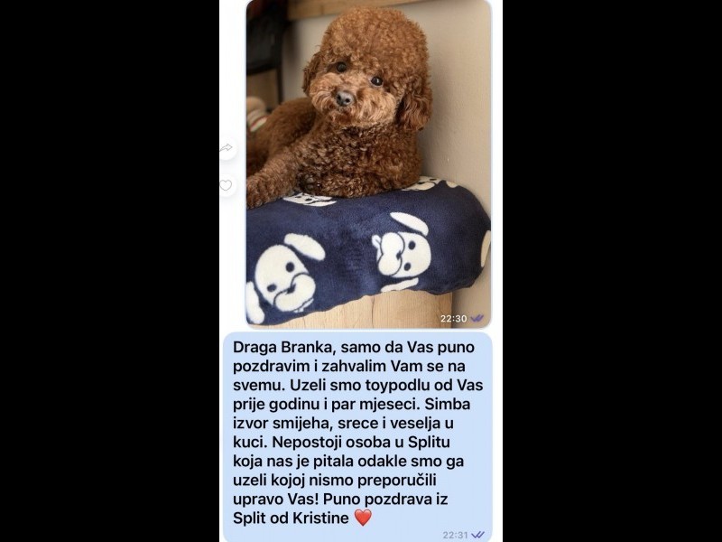 Nasa odgajivacnica se nalazi u Indjiji i bavimo se uzgojom pasa 15 godina. Trenutno imamo u ponudi leglo ostenjeno 01.03.2026. U toku su rezervacije. U ponudi je crvena Tea Cup zenkica 5,5 meseci stara. Izrasla je svoju visinu i kao odrasla zenka ce biti visoka i teska: Teska je 1,5 kg Visoka 19 cm Stenci od nas idu u novi dom posle primnjene sve 3 sedmovalentne Vangard vakcine. Mozete doci kod nas bez obaveze kupovine da bi upoznali nase pse, stence a i nas kao odgajivace.Nasi odrasli psi imaju uradjene sve genetske analize za pudle: Patella lux free, PRA-prcd N/N, PRA-rcd4 N/N, vWD1 N/N, DM2 N/N, NEWS N/N, B lokus B/B, E lokus e/e U nasoj odgajivacnici akcenat smo stavili na zdravlje, tako da vam mozemo garantovati da kod nas uzimate toy, ili ako se odlucite za patuljasto (to sto zelite to cete i dobiti kod nas u odgajivacnici, nema iznenadjenja u bilo kom smislu) genetski zdravo i socijalizovano stene pudle. Tek posle godinu dana krenu da izlaze zdravstveni problemi kod pasa , naravno da necete odbaciti vaseg psa tada i zato je mnogo bitno da ste sigurni da je stene zdravo i cistokrvna pudla. Znate i sami, pudle su 2. po redu najpametnijih pasa na svetu, veoma su umiljate i nezne ali istovremeno razigrani i odani pratioci.Dajemo Vam svu podrsku oko svega sto treba da znate: Vaspitanje, ishrana i higijena u bilo kom momentu odrastanja. Tu smo za svaku vasu dilemu, pitanje, pomoc: +38162257865 Email: djordjevicbranka8@gmail.com